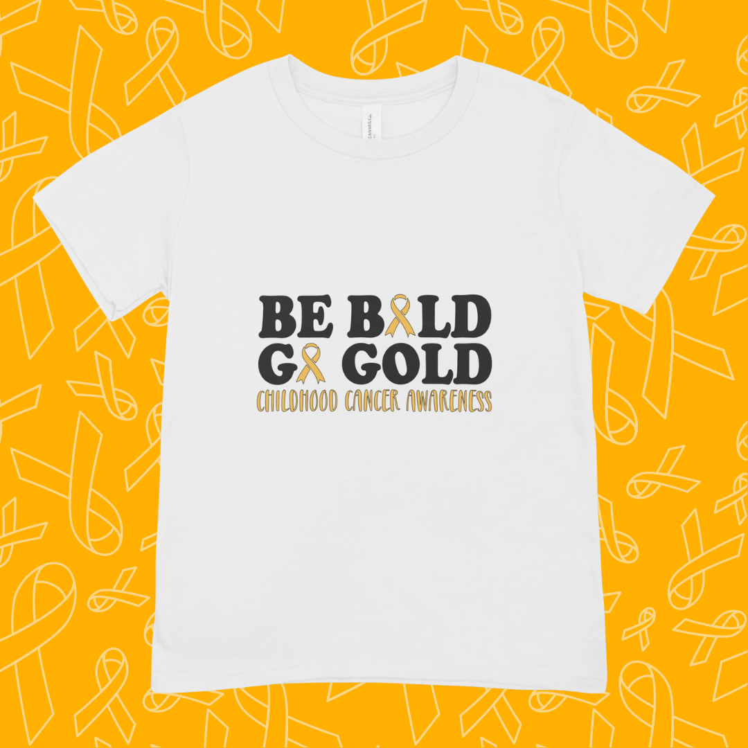 A text-based design with the words "Be Bold, Go Gold" over two lines. The letter 'o' within 'bold' and the letter 'o' within the word 'go' has been substituted for a cancer ribbon.