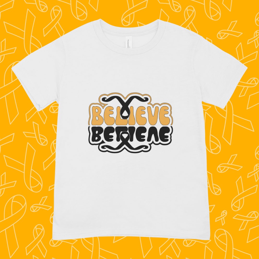 The top word 'Believe' and outline is printed in gold. The rest of the design and the cancer ribbons are printed in black.