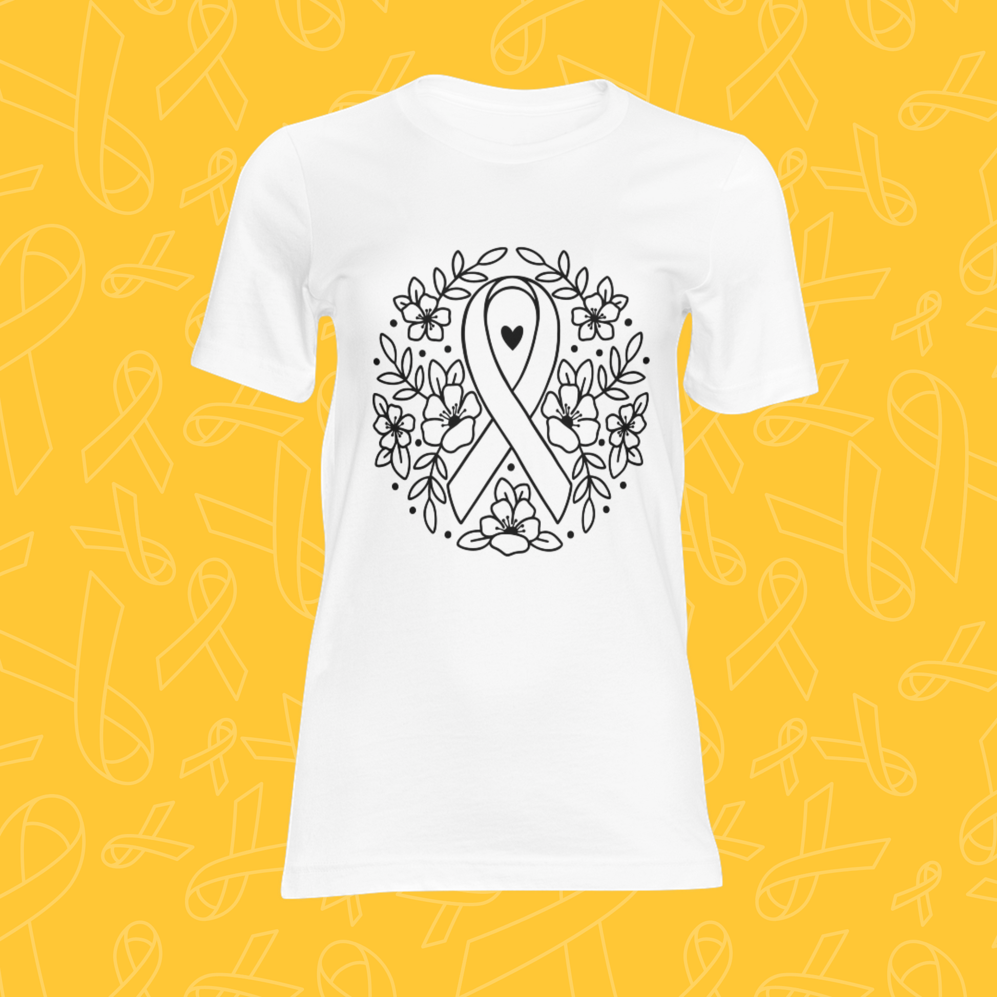 A floral and leaf design that is made to surround a Cancer ribbon in the centre. The overall design forms a circular shape.