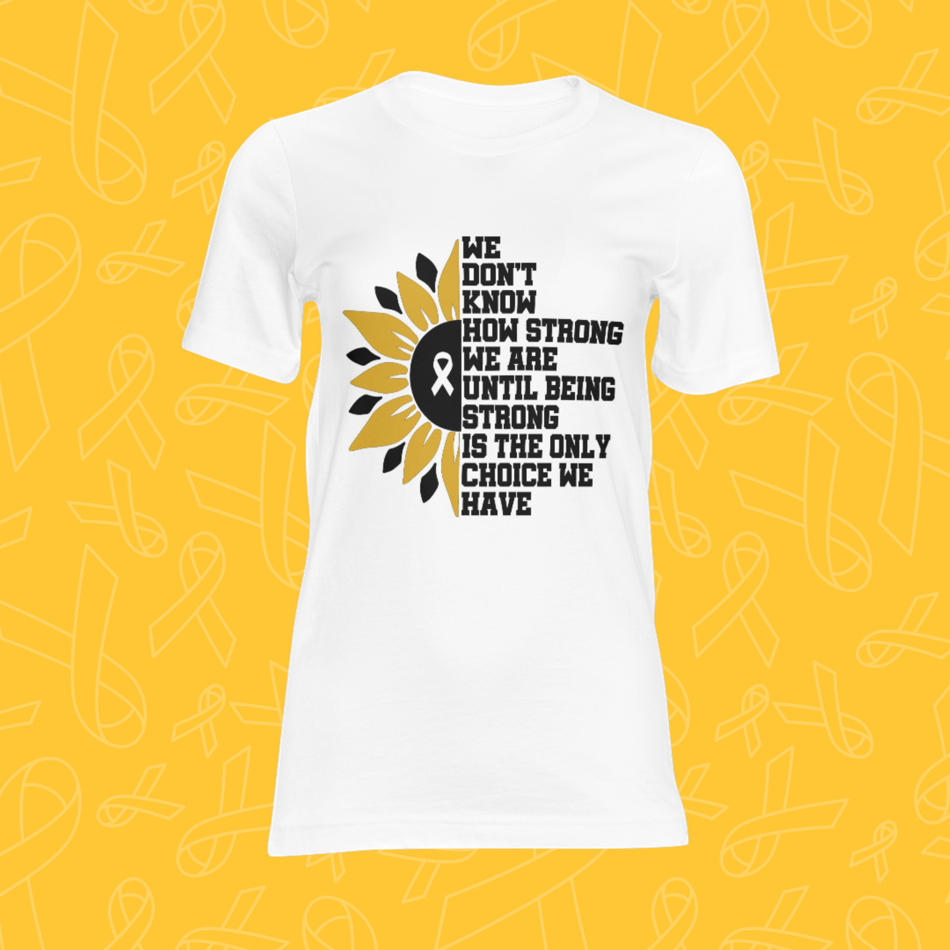 A bold, half of a sunflower, design with a cancer ribbon in the center. To the right of the flower, a layout of words that read: "We don't know how strong we are, until being strong is the only choice we have". The overall design forms an almost circular shape.